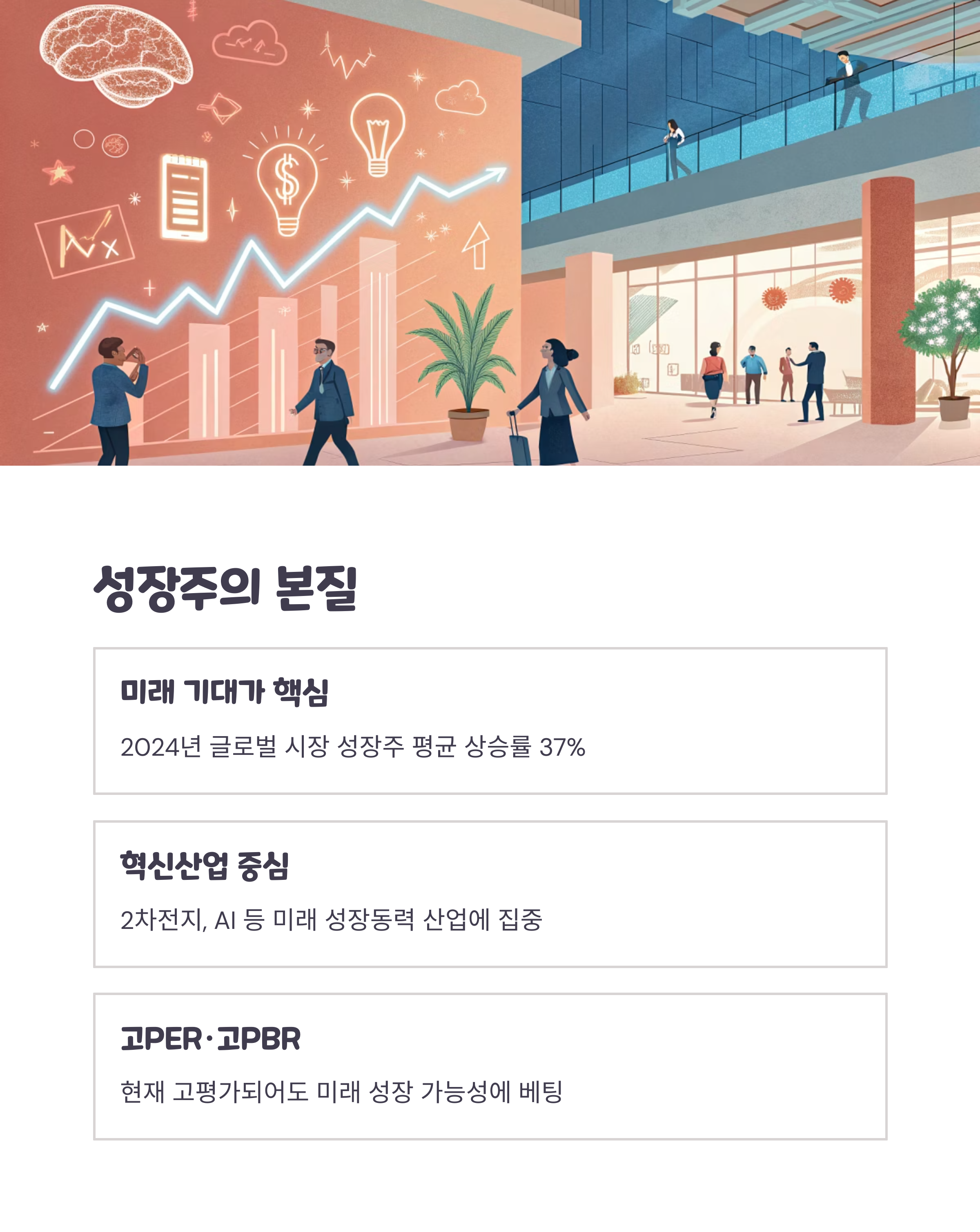 성장주는 현재보다 미래의 잠재력에 투자하는 전략입니다. 네이버, 카카오, 아마존, 테슬라처럼 빠른 성장을 예측할 수 있는 기업이 대표적인 예입니다. 이러한 기업은 높은 PER, PBR을 가지고 있지만, 그만큼 미래 성장성에 대한 기대가 크다는 의미입니다.