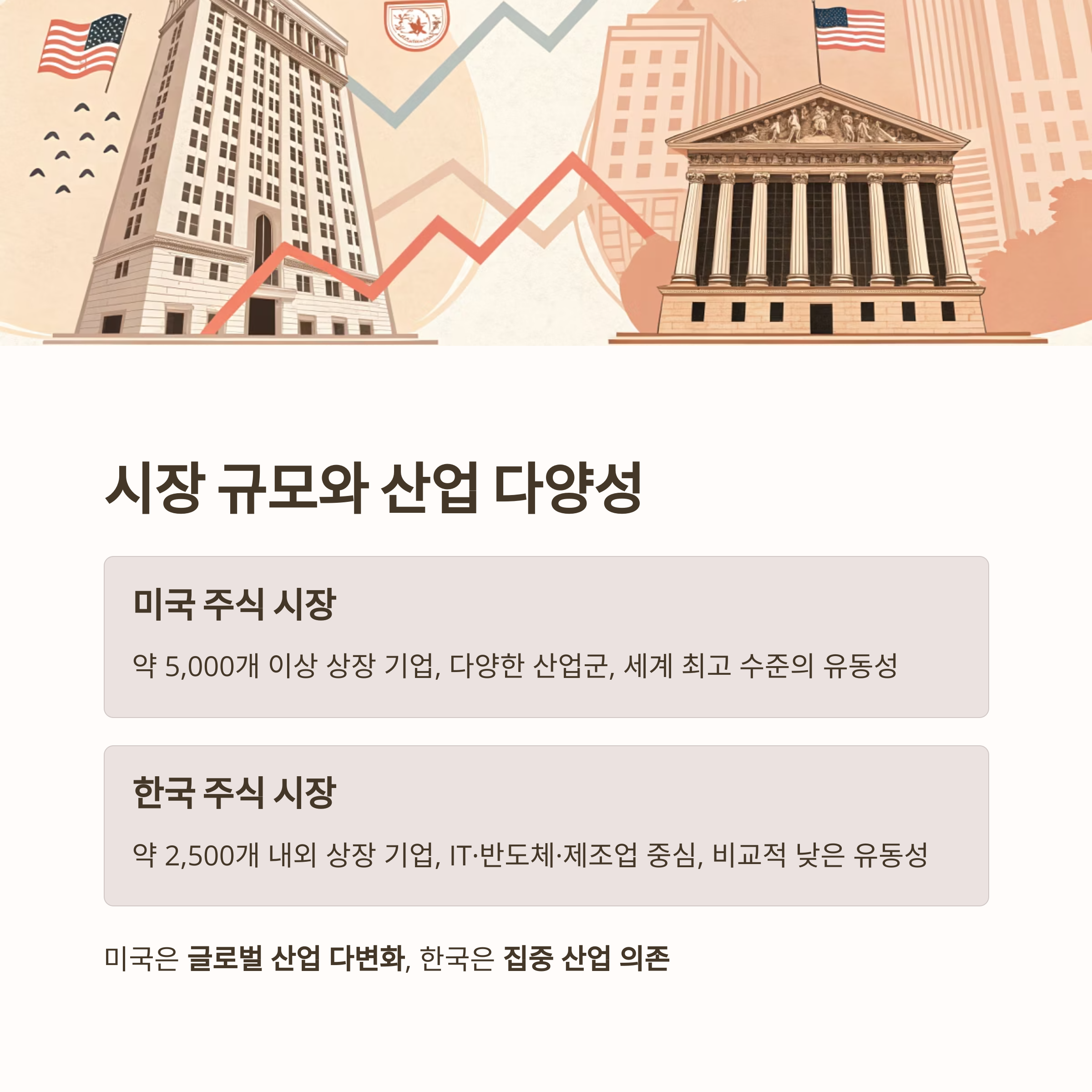 미국 vs 한국 주식 시장 규모와 산업 다양성 비교표