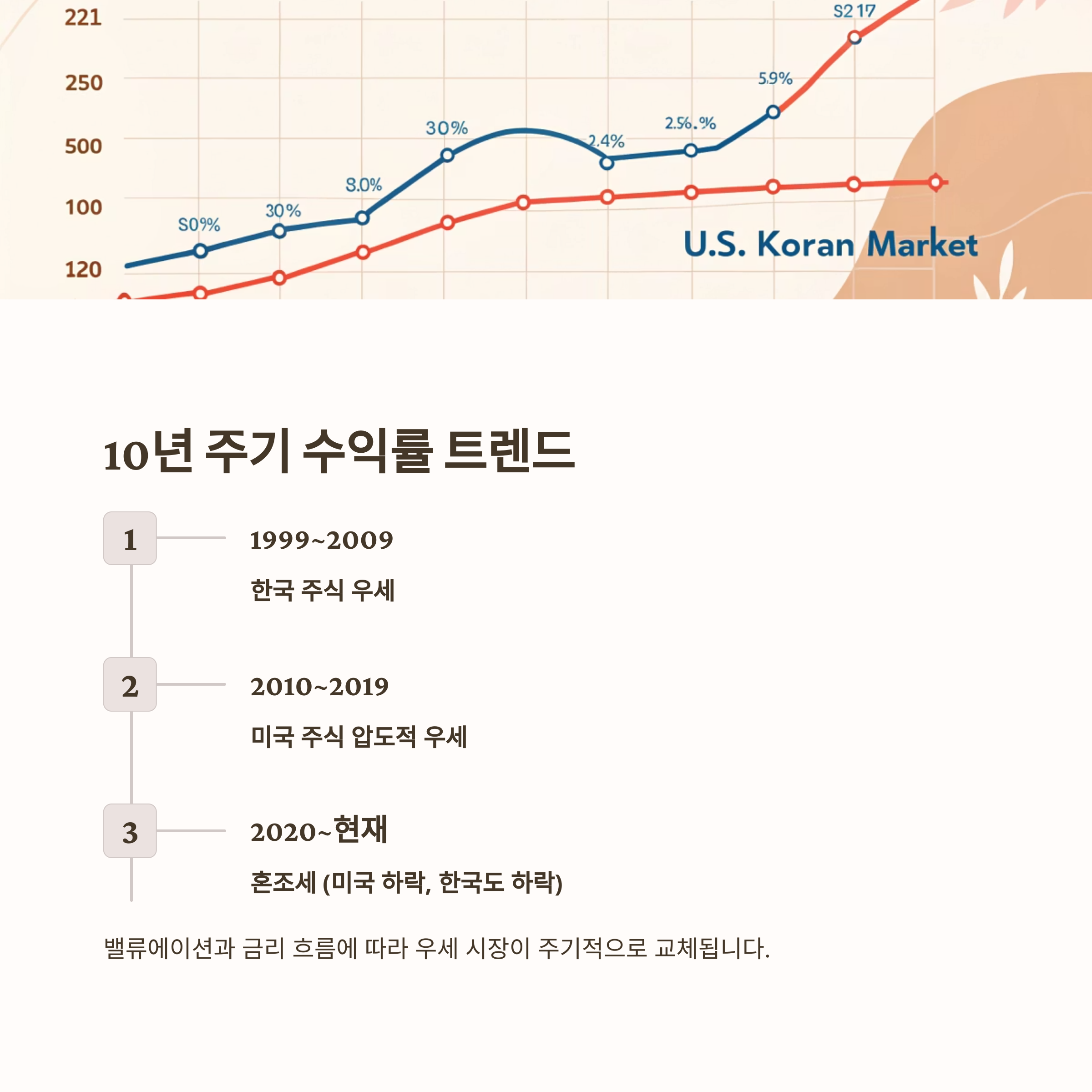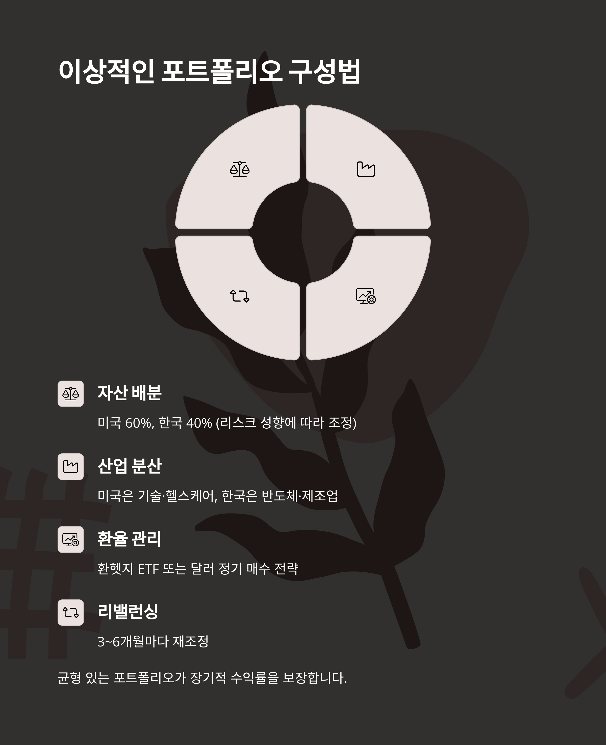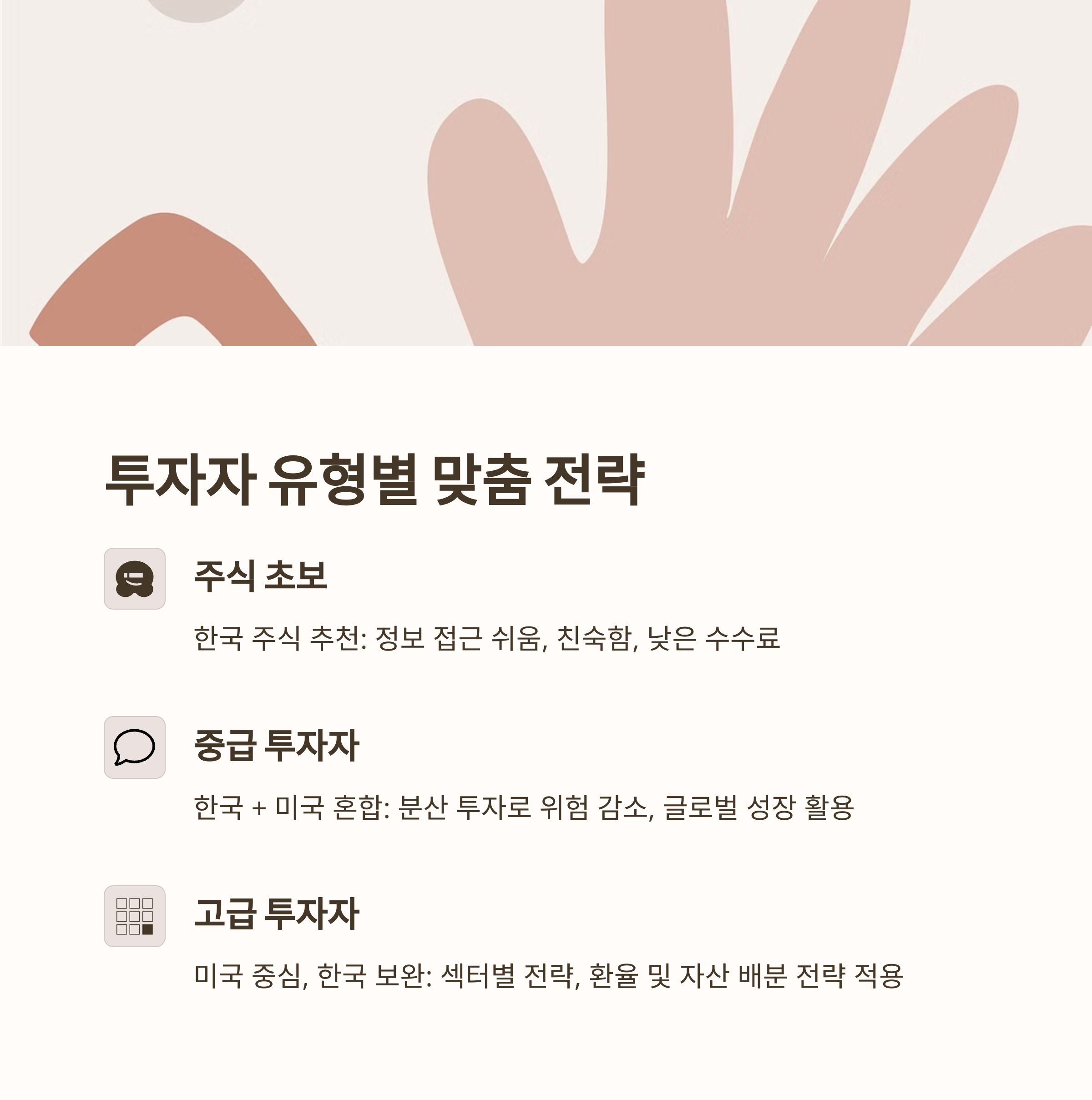 | 고급 투자자 | 미국 중심, 한국 보완 | 섹터별 전략, 환율 및 자산 배분 전략 적용 가능 |